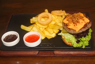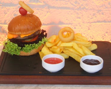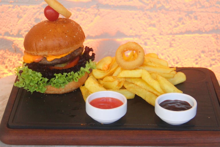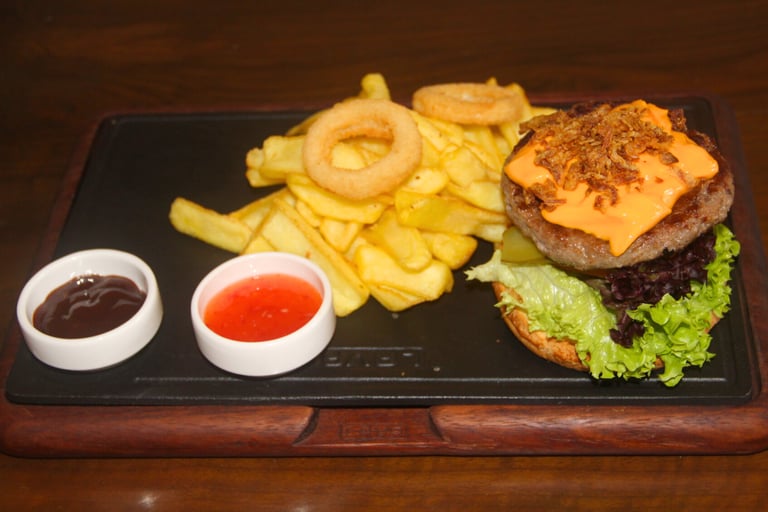 160 gr. Dana Burger Köfte, Dana Füme Kaburga, Cheddar Peyniri, Burger Sos, Marul, Kıtır Soğan, Domates, Turşu, Kaşık Patates Tava, Soğan Halkası ile.