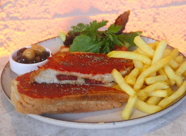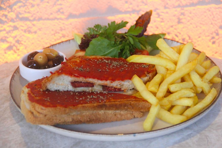 Kızarmış ekşi mayalı ekmek üzerine; zeytin ezmesi ve labne sos, kaşar&cheddar, dana jambon, çırpılmış yumurta (scrambled egg), maydonoz, yeşil soğan.