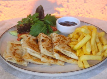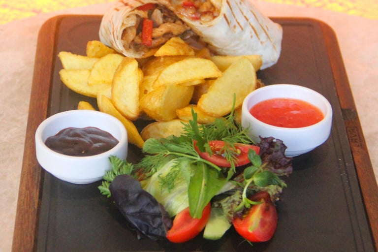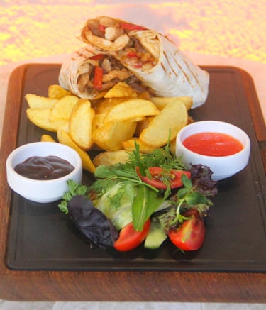 Tortilla ekmeğinde; Dana Bonfile, Mantar, Soğan, Renkli Biber. Mevsim Yeşillikleri ve Elma Dilim Patates ile servis edilir.