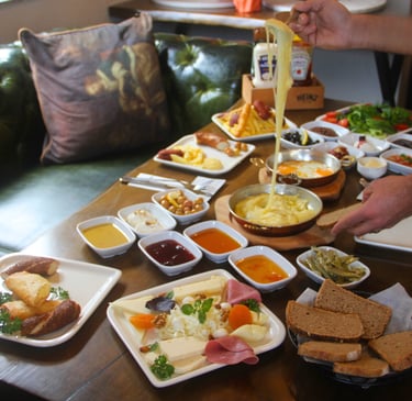 Sucuk, Füme Kaburga, Cheddar ve Kaşar Peyniri. Patates Tava, Yeşillik ve Zeytin ile servis edilir.