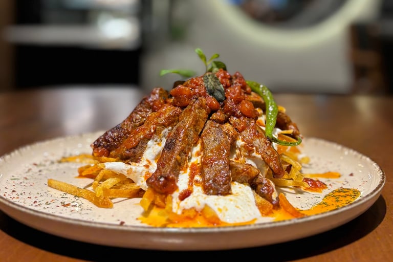 Dana Bonfile Parçaları, Kibrit Patates, Yoğurt ve Domates Sosu.