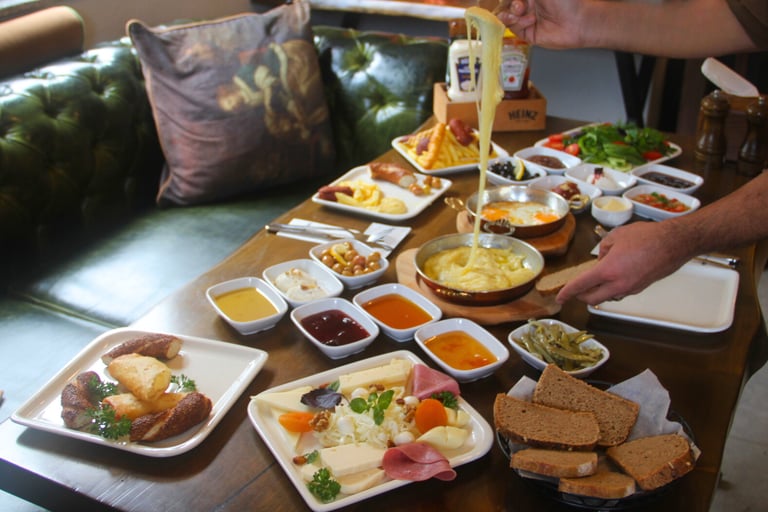 Ezine Peyniri, Kaşar Peyniri, Kelle Peyniri, Çeçil Peyniri, 3 Çeşit Reçel, Çikolata, Tahin-Pekmez, Bal, Kaymak, Tereyağı, Sele Zeytin, Kırma Zeytin, Söğüş Tabağı, Dana Jambon, Sosis, Sigara Böreği, Patates Tabağı, Sahanda Yumurta, Simit, Kuru Kayısı, Ceviz, Sınırsız Çay.